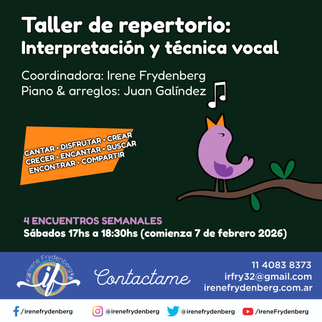 En esta nueva versión del Taller de Repertorio, Juan Galíndez y yo -Irene Frydenberg- te acompañamos en piano, técnica vocal y expresividad para que construyas tu versión de la o las canciones que elijas cantar.